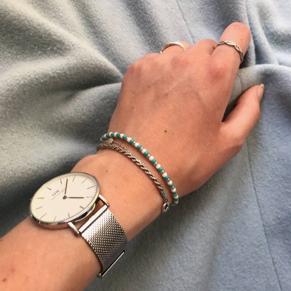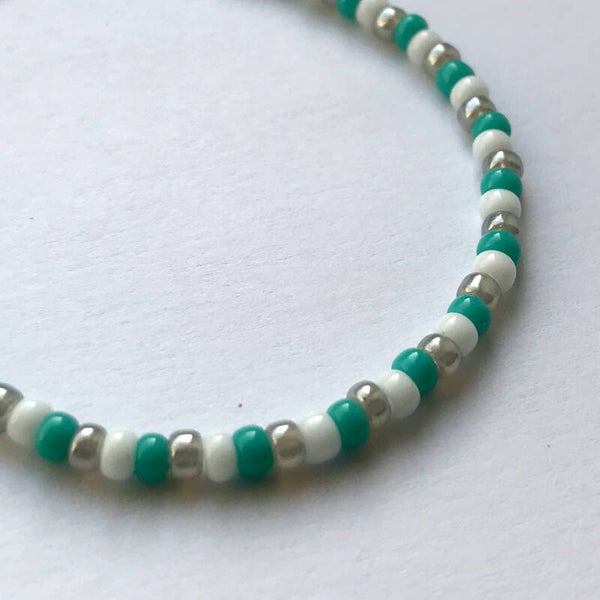 Keuze uit het "Beach Life" armbandje of enkelbandje. Beide zijn gemaakt van 3mm miyuki kraaltjes in de kleuren turquoise, zilver en wit. Materialen zullen bij zorgvuldig gebruik niet verkleuren, pas wel op met chemische middelen zoals parfum of chloor. Daar kunnen de meeste materialen minder goed tegen.
