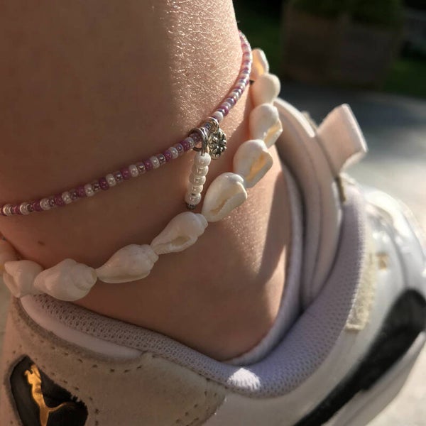 Keuze uit het "Trumpet Seashell" armbandje of enkelbandje. Beide zijn gemaakt van echte witte trompet schelpen. Super leuk om alleen te dragen of te combineren met je favoriete sieraden!