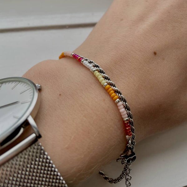 Keuze uit het "Sunset Lover" armbandje of enkelbandje. Beide zijn gemaakt van 2mm miyuki kraaltjes in de tinten rood, roze, oranje, geel en wit. De verschillende kleuren worden afgewisseld door zilveren miyuki kraaltjes die ook 2mm zijn.