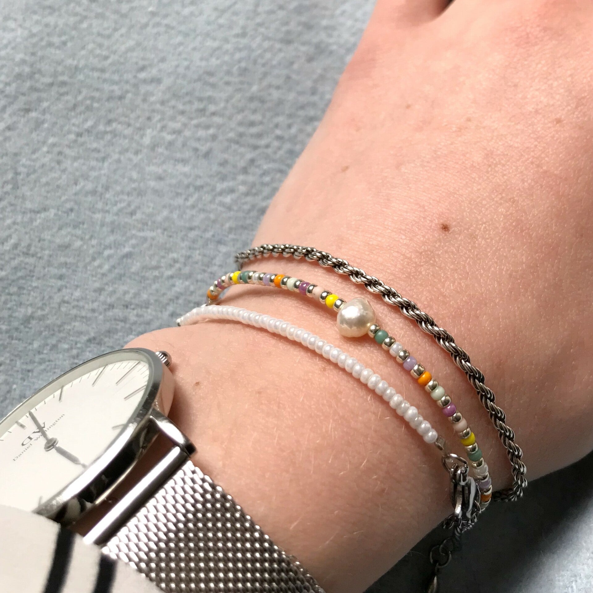 - Materiaal: Roestvrijstaal (sluiting en verlengstuk), 2mm miyuki rocailles en witte zoetwaterparel