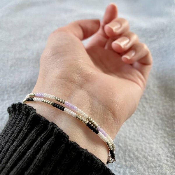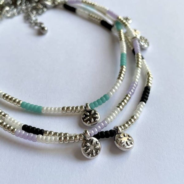Keuze uit het "Colorful Chic" armbandje of enkelbandje. Allen zijn gemaakt van 2mm miyuki kraaltjes. Witte en zilveren kraaltjes worden afgewisseld met een kleur naar keuze: zwart, turquoise of lila. De enkelbandjes bevatten 3 hangertjes.