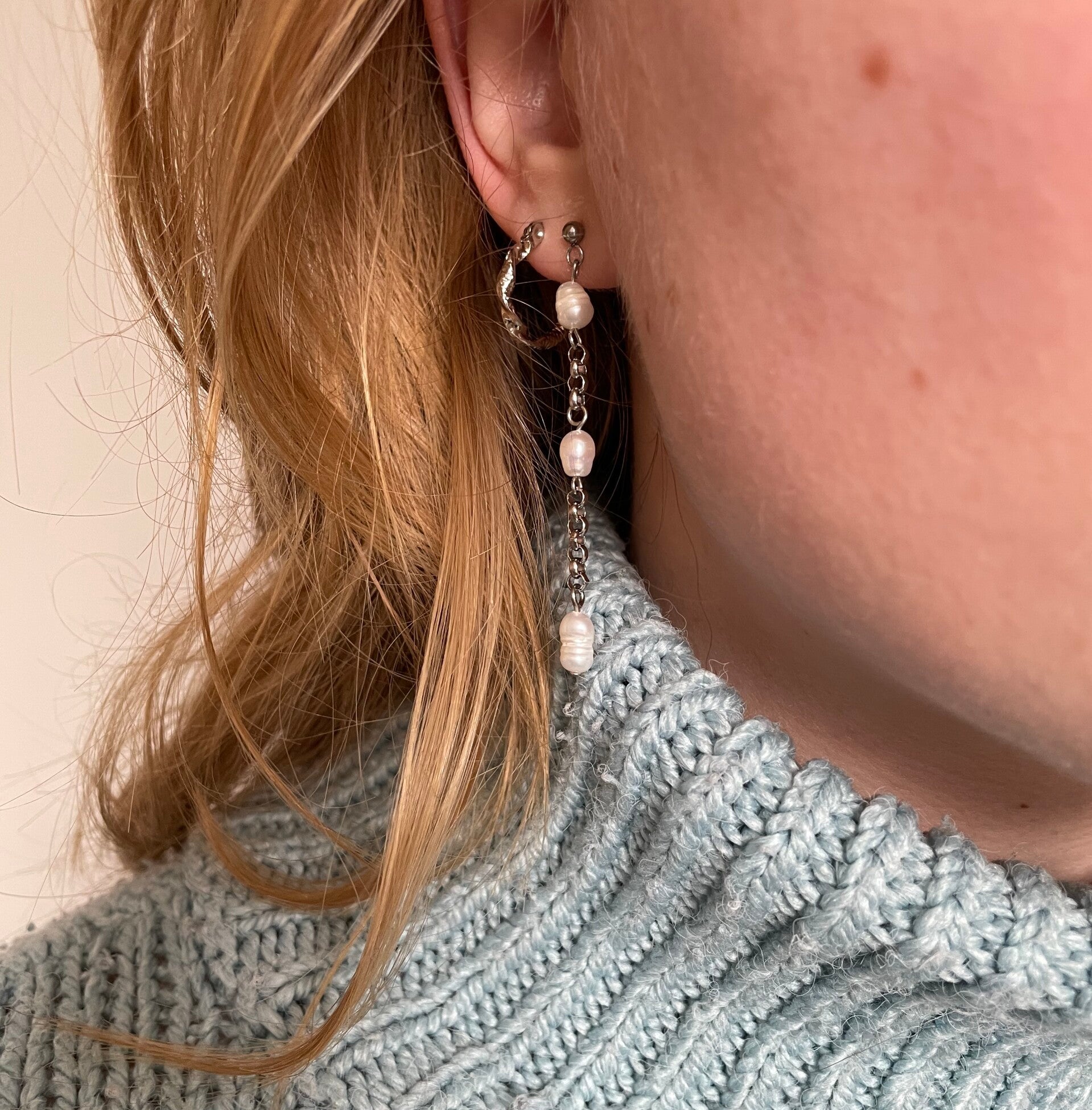 - Materiaal: Roestvrijstaal (oorbel steker en ketting) en echte zoetwaterparels